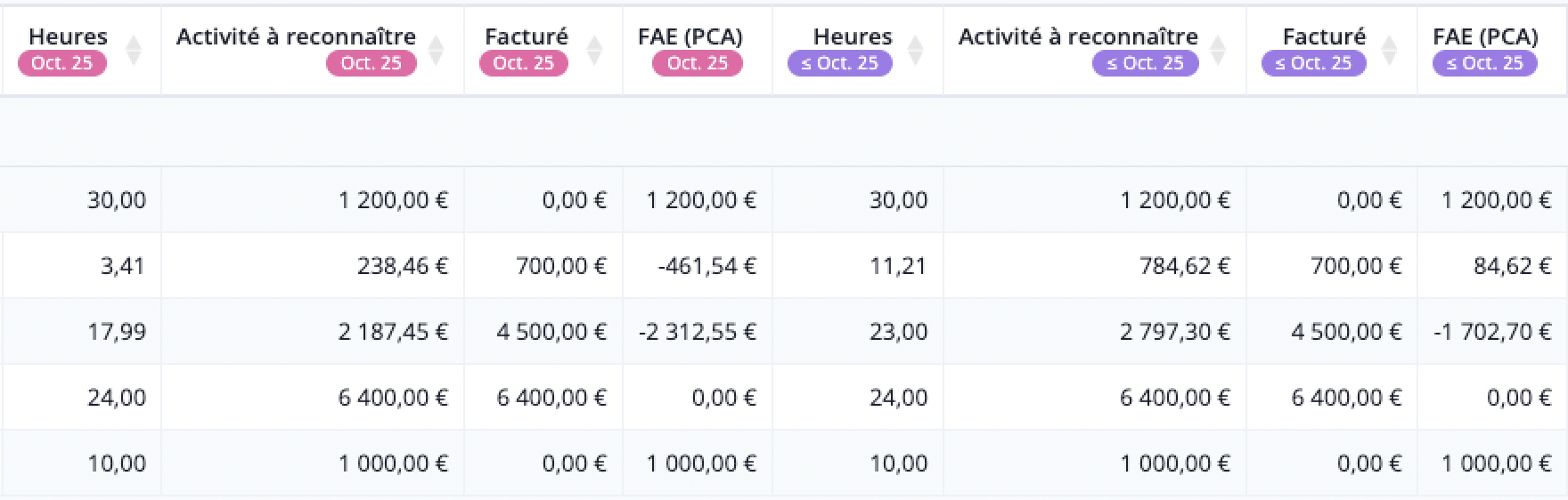 - FAE / PCA : correspond à l’écart entre les montants des indicateurs Activité à reconnaître et Facturé ; il s’agit d’un PCA si le montant est négatif, ou d’une FAE si le montant est positif.