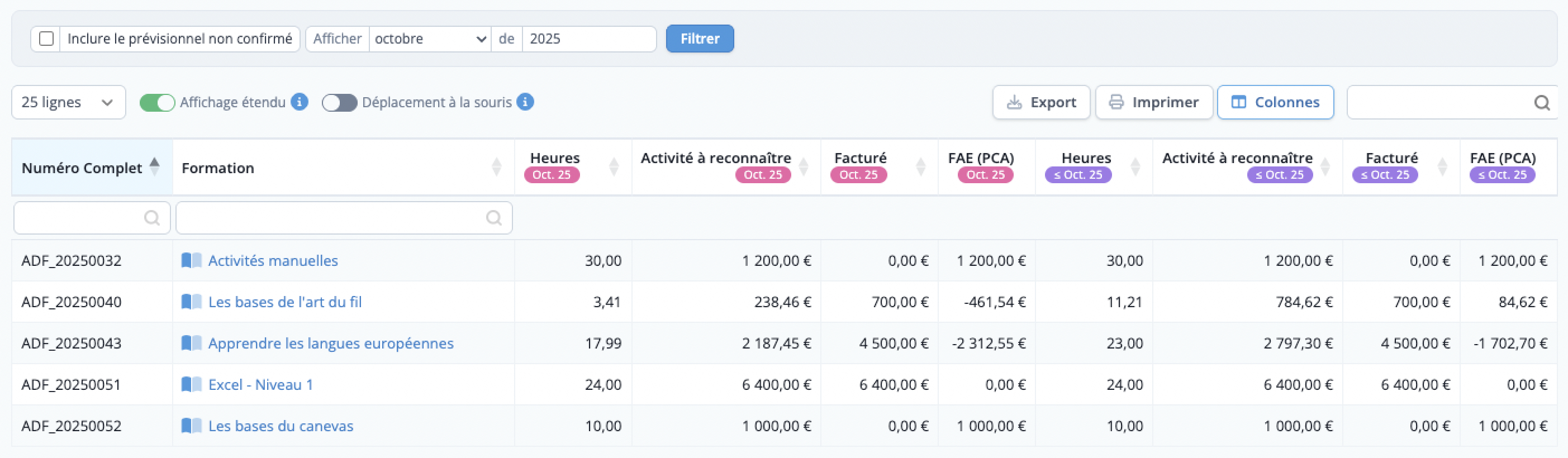 → Par exemple, si une ADF est programmée du 1er au 31 mai 2025 mais a été facturée le 15 avril 2025, alors au 30 avril 2025, Dendreo affiche un PCA car la prestation n’a pas encore été réalisée.
