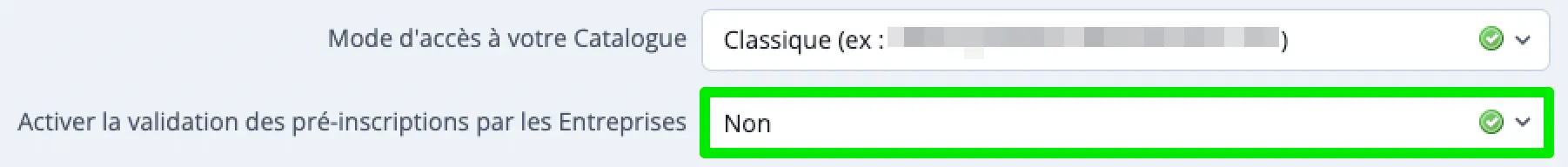 - Si vous avez activé l'option Extranet Entreprise, au champ Activer la validation des pré-inscriptions par les Entreprises, sélectionnez Non pour que les salariés bénéficient de cette automatisation. Sinon, leur demande d'inscription ne se validera pas automatiquement.