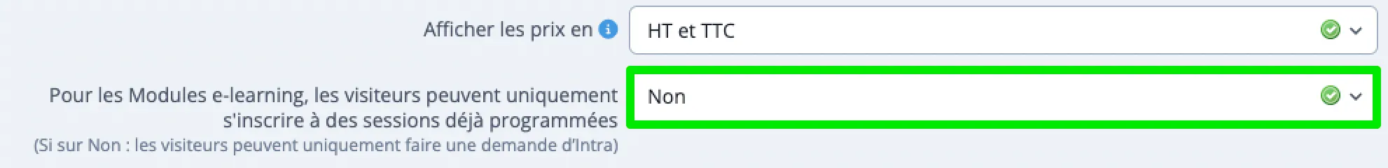 - Au champ Pour les Modules e-learning, les visiteurs peuvent uniquement s'inscrire à des sessions déjà programmées, sélectionnez Non. En effet, lorsque le Participant s’inscrit pour un Module e-learning, cela crée une Action de Formation spécialement pour lui (= une ADF INTRA mono-participant, reprenant les paramètres renseignés par défaut dans le Module).