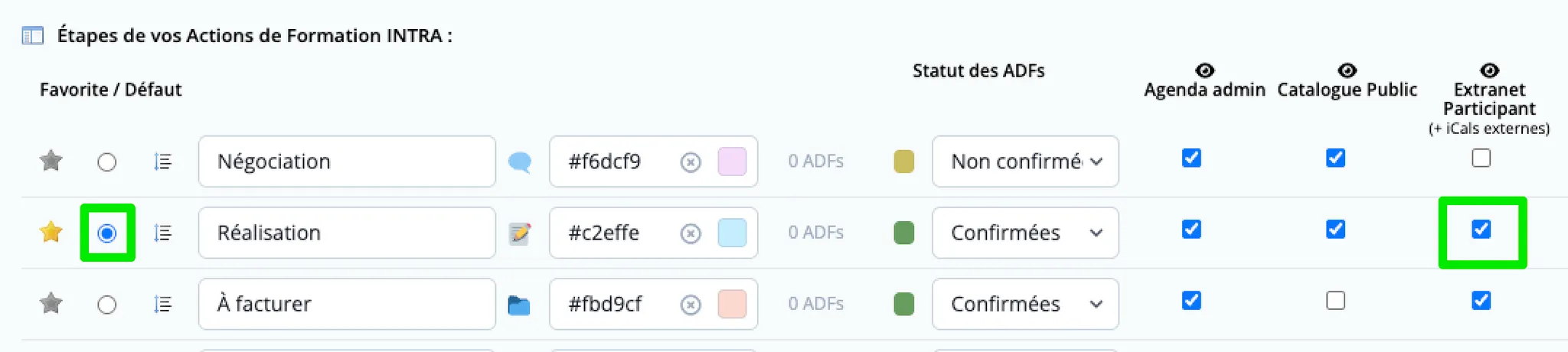 Au niveau des Étapes de vos Actions de Formation INTRA, l’Étape sélectionnée par défaut (cochée dans la colonne Défaut) doit être visible sur les Extranets Participants (cochée dans la colonne Extranet Participant).