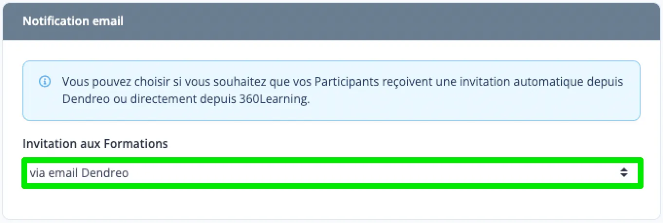 Au champ Invitation aux Formations, sélectionnez Via Email Dendreo.