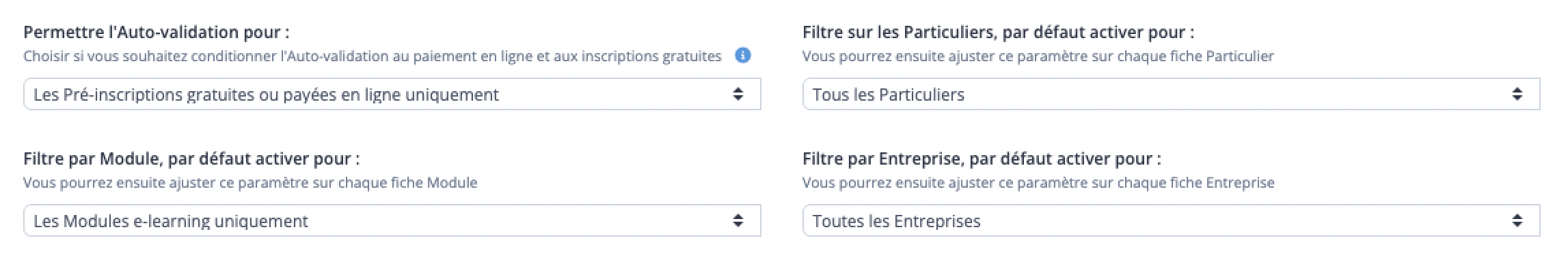 À noter : vous pouvez ajuster vos critères d'auto-validation, en gardant à l'esprit que si ceux-ci sont trop restrictifs, les demandes ne pourront pas être automatiquement validées. Nous vous recommandons de lire attentivement notre documentation Utiliser l'auto-validation des Pré-inscriptions pour vous guider dans la mise en place des différents paramètres à sélectionner.