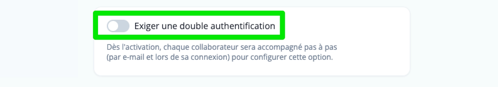 Deux choix s’offrent à vous concernant l’activation de la double authentification : l’exiger pour l’ensemble de vos collaborateurs, ou laisser chaque collaborateur décider librement de son activation.