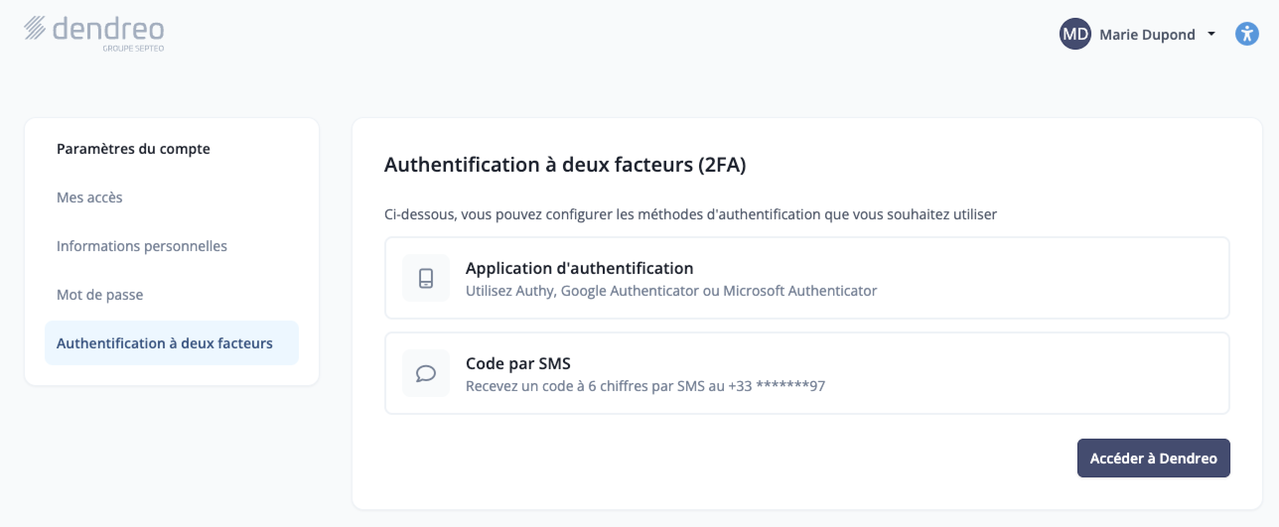 Pour vous connecter à votre compte ou Extranet Dendreo, vous commencez par entrer votre identifiant et mot de passe habituels. Si la double authentification est activée, vous recevez ensuite un code à 6 chiffres par SMS ou bien depuis une application dédiée, selon ce que vous avez défini en configuration.