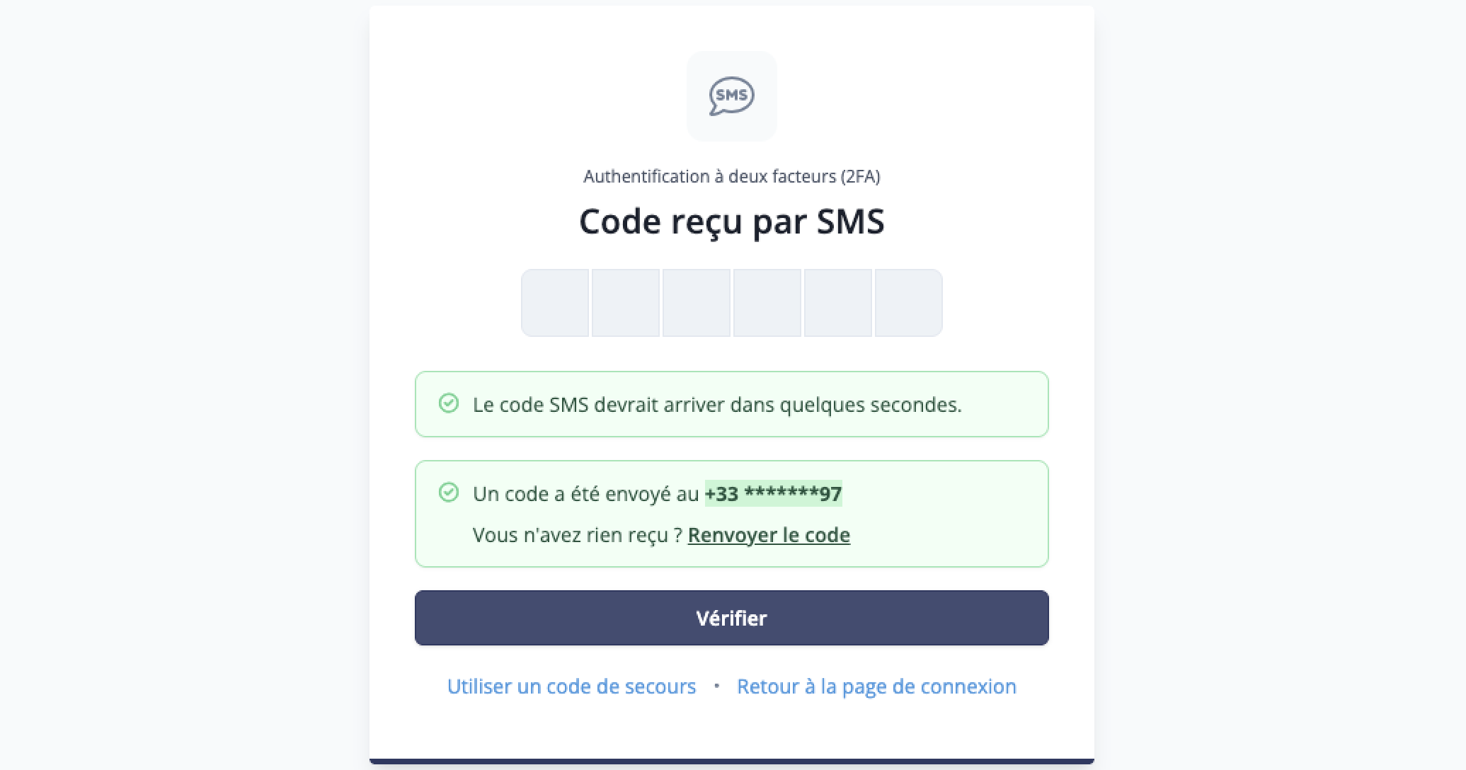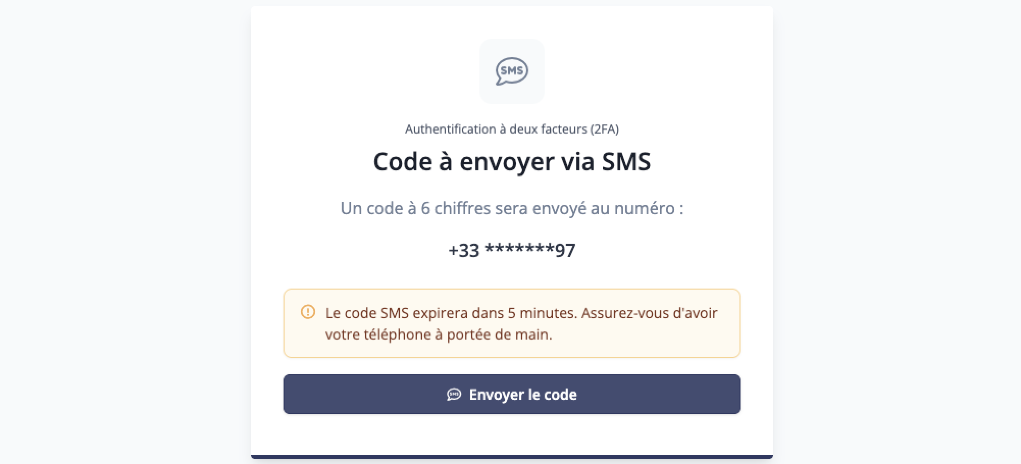 Attention : le code reçu par sms expire au bout de 5 minutes ! Passé ce délai, vous devrez demander à renvoyer un nouveau code pour finaliser l'authentification.